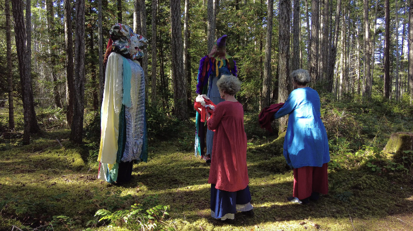 2025 Forest grove shot of Tannis & Barbara offering the ancestral story shawls back to the ancient ancestress, Gabriola Island, BC, Canada.